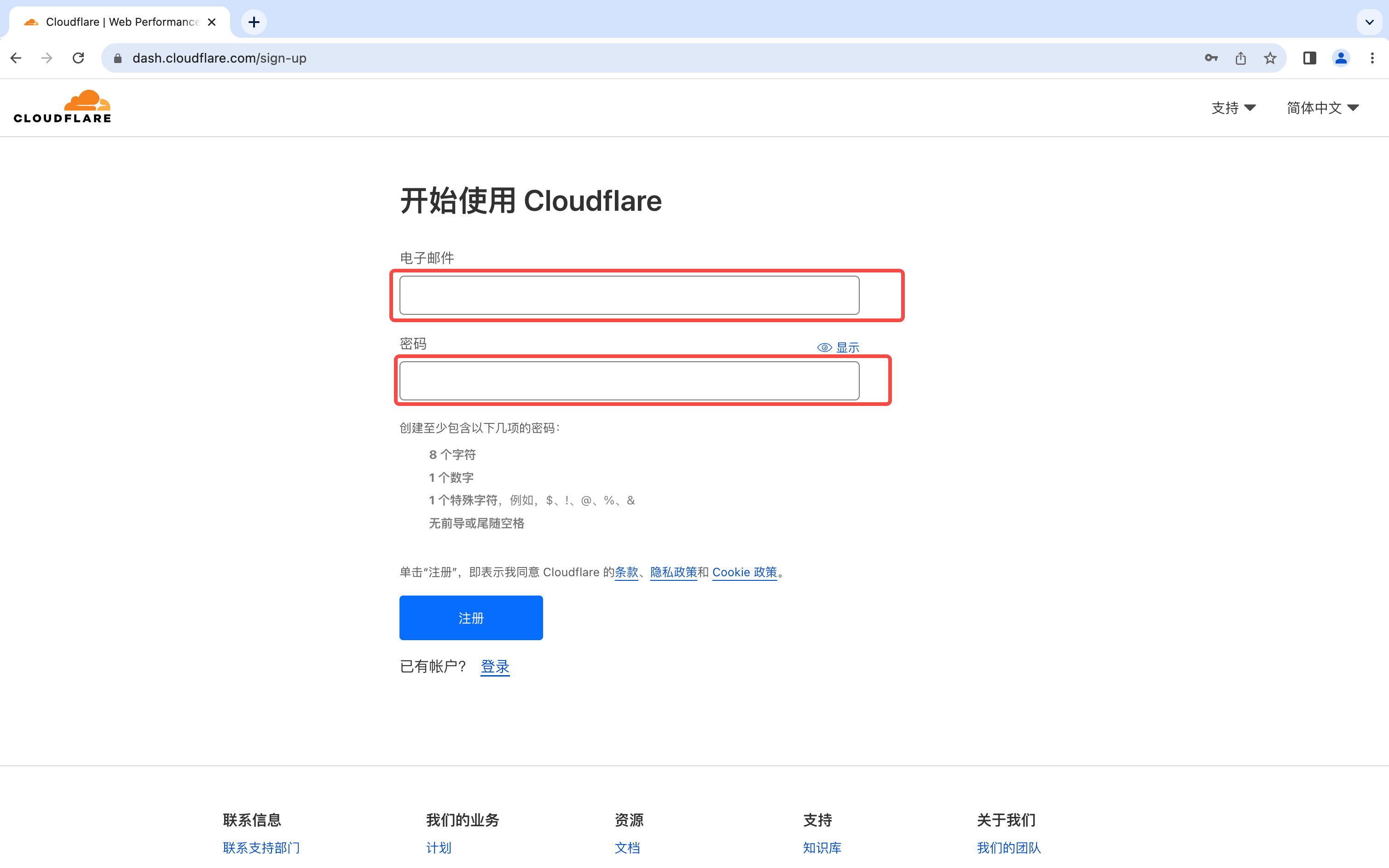 输入邮箱和密码,点击注册,注册成功之后,点击登陆链接https://dash.cloudflare.com/login进入,输入邮箱和密码登陆就可以登陆了。