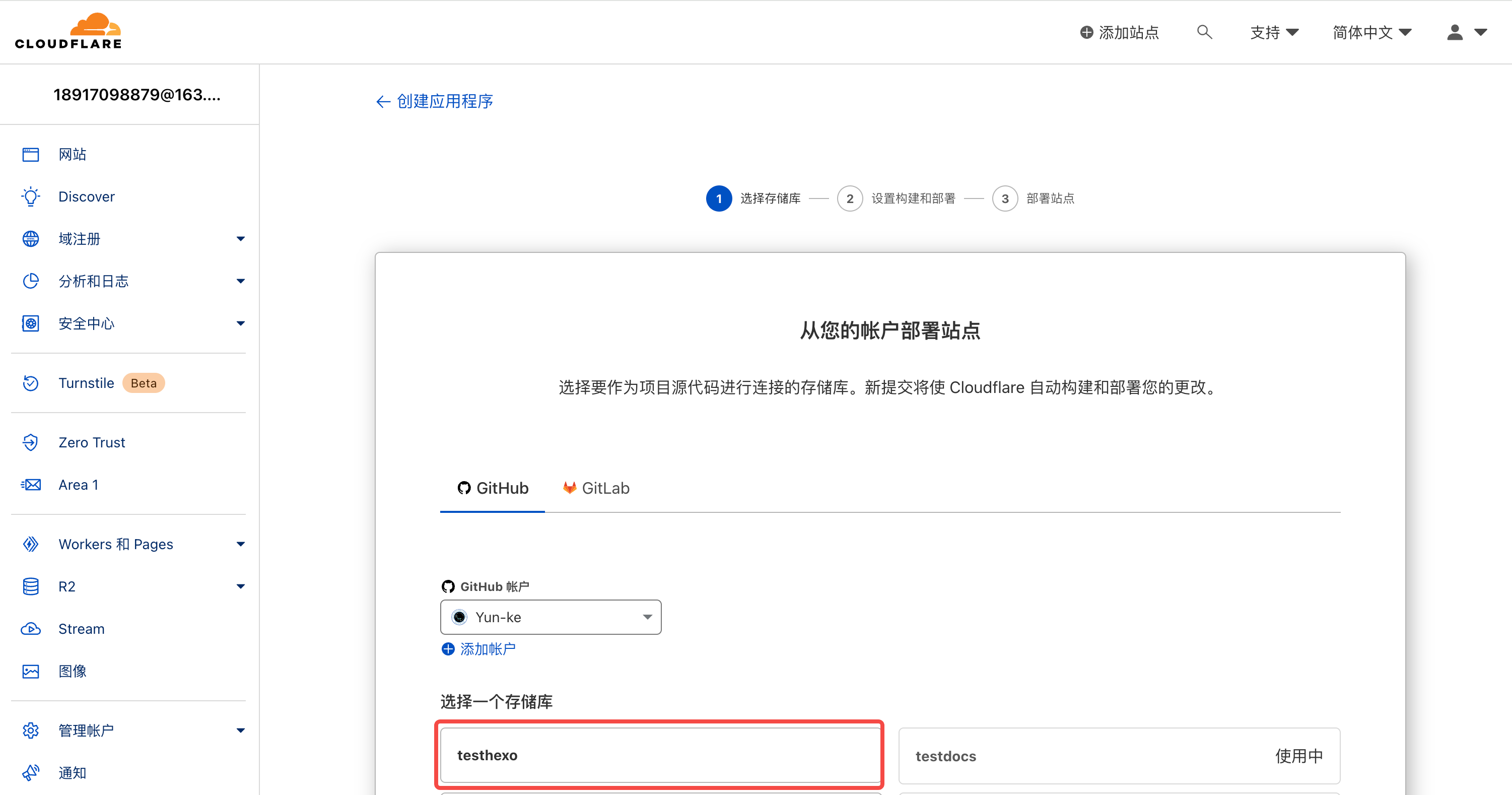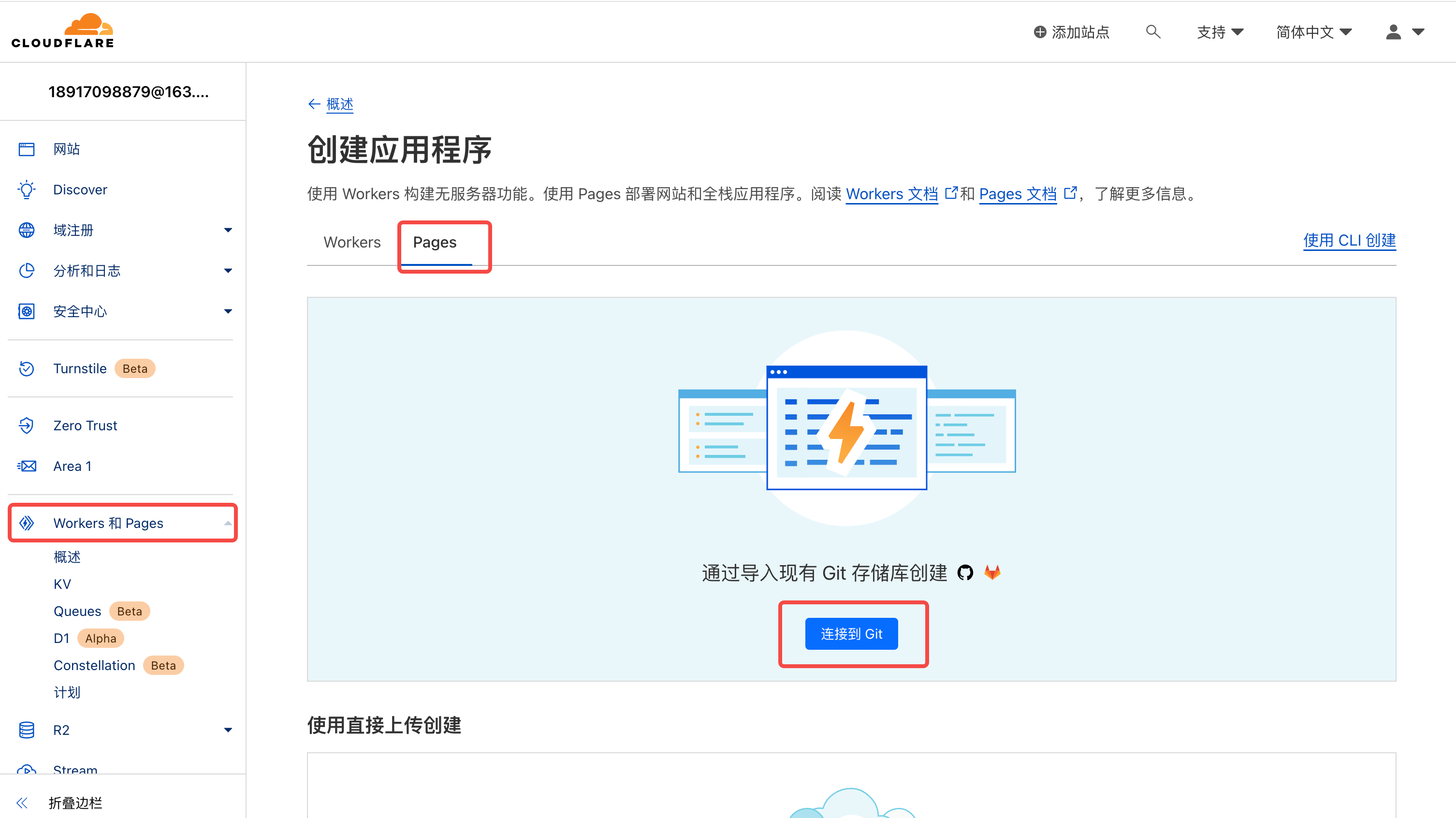 点击Cloudflare登陆链接https://dash.cloudflare.com/login登陆进入,然后选择Workers和Pages中的Pages,选择连接到git: