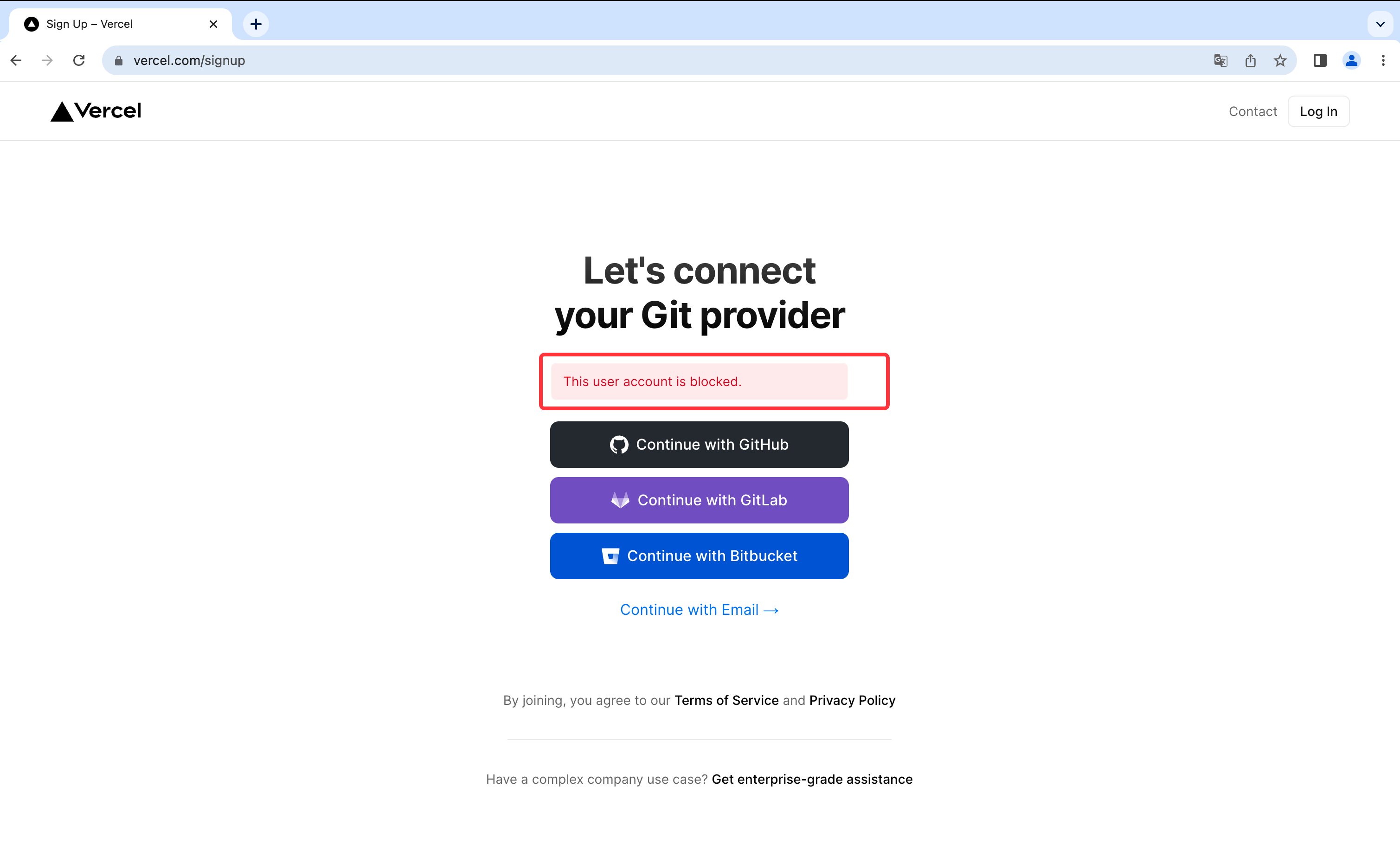 但是不知道是什么原因,Vercel我这边GitHub用户注册一直失败,如下所示: